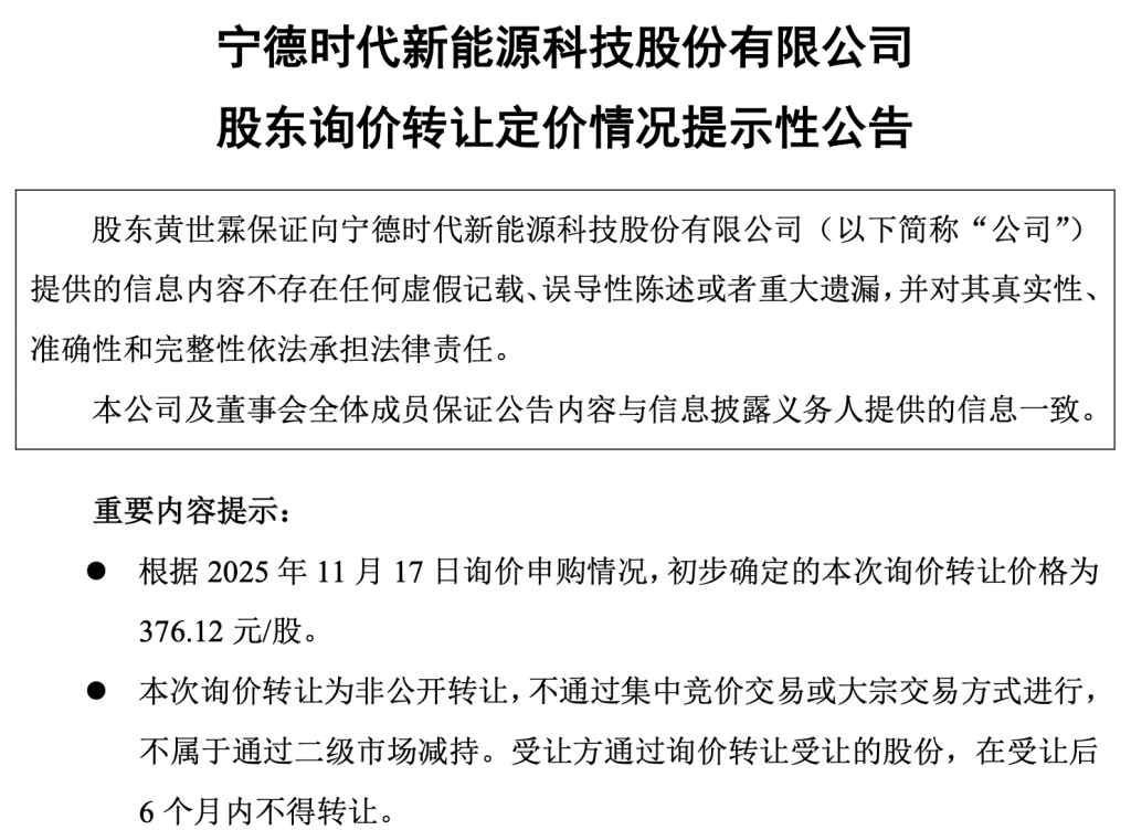 There has been a new development in the multi-billion yuan share reduction by Huang Shilin, co-founder and third-largest shareholder of CATL (300750.SZ/03750.HK), a leading domestic lithium battery manufacturer. On the evening of November 17, CATL announced that, based on the subscription results of the day, the preliminary determined transfer price for this inquiry was 376.12 yuan per share.
