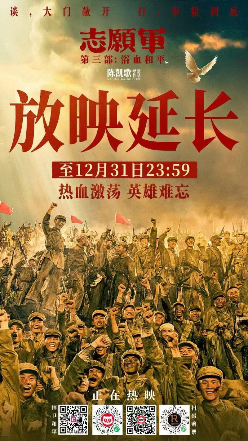 On November 20, the official Weibo account of the film "The Chinese People's Volunteers: Bloodshed and Peace" announced that the screening would be extended to 23:59 on December 31.