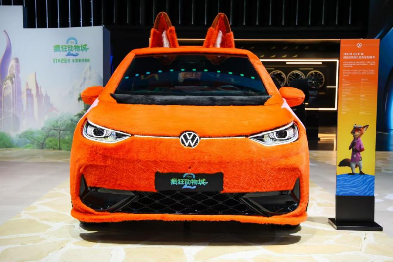 In the interactive area of the booth, the ID.3 GTX Zootopia 2 Nick Wilde custom vehicle attracted many visitors to take photos with its bright orange paint job and themed design.